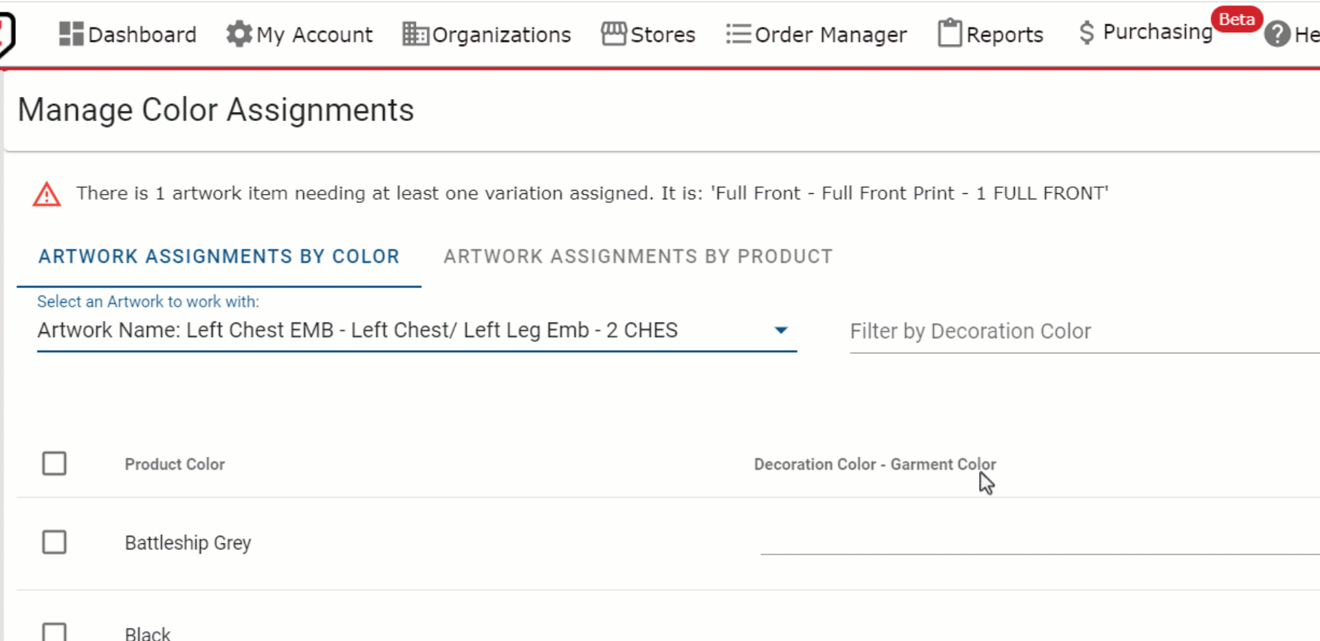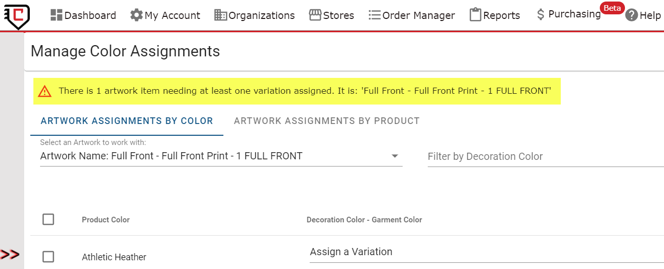 2. An alert at the top will let you know which artworks need Color Assignment - filter by these artwork(s).